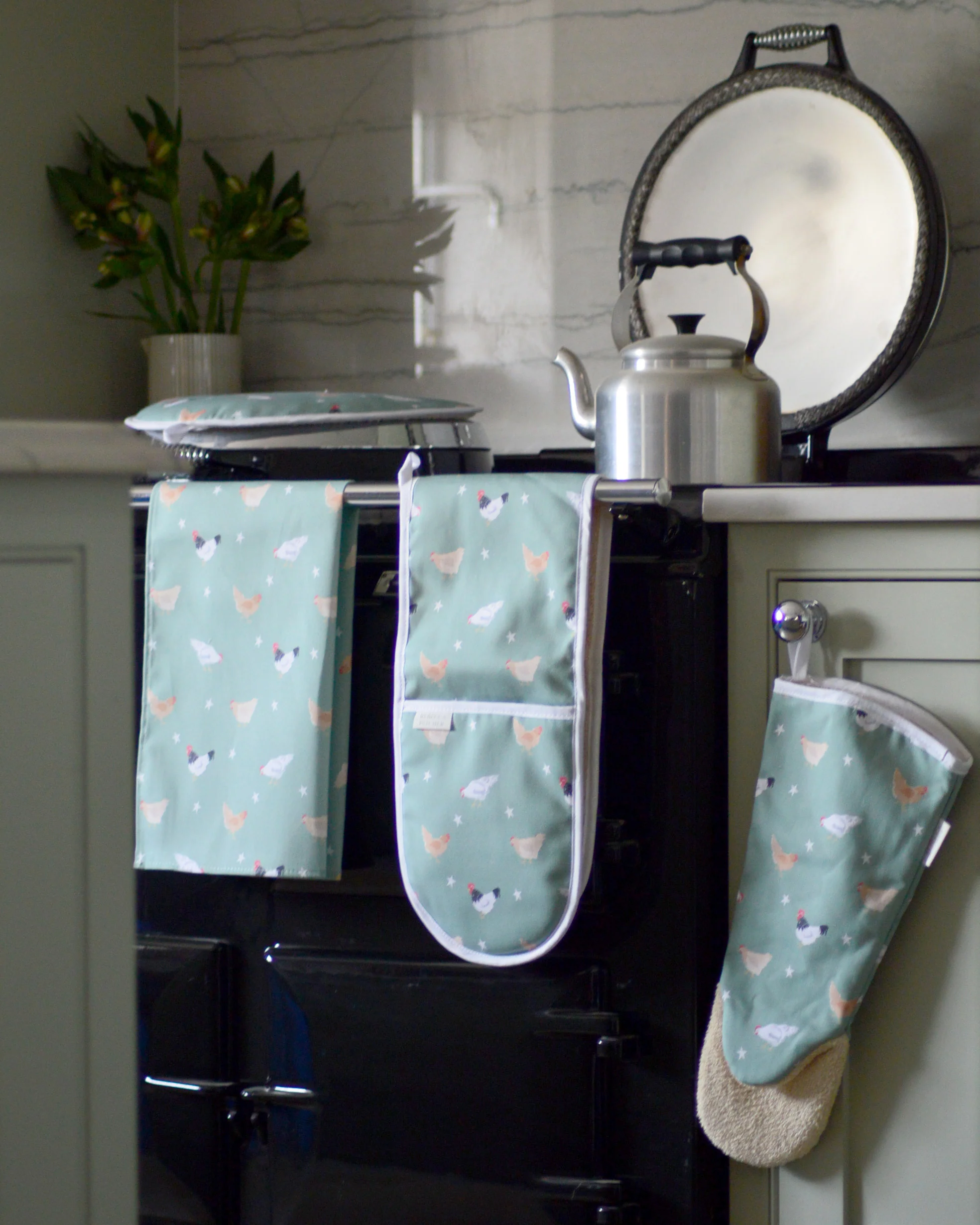Perfect for adding a dash of springtime charm to your kitchen, our sage green chicken design gauntlet will protect your arms right up to the elbow when reaching deep into the cooker.Â