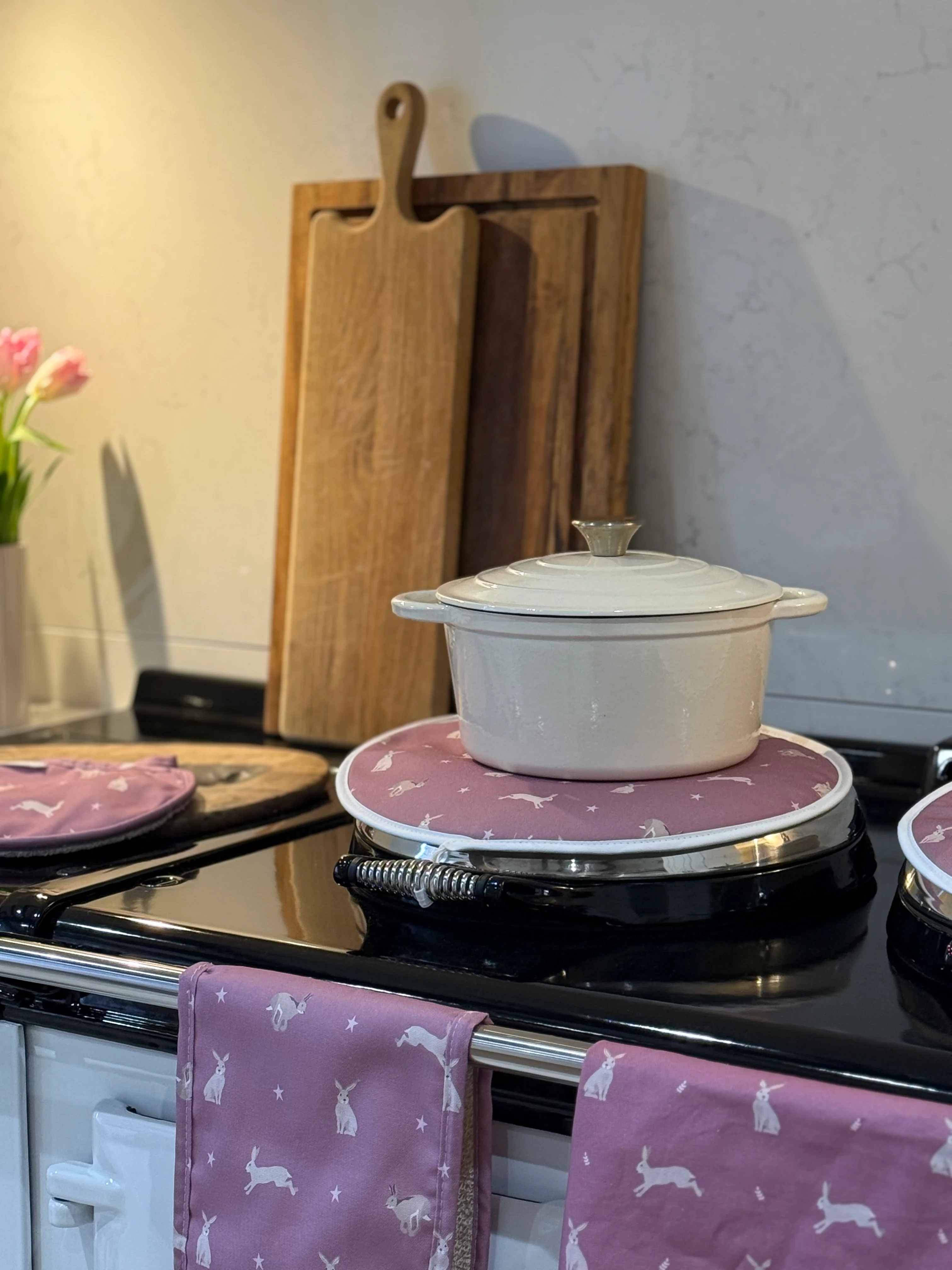 Made for country kitchens, where there's always something delicious in the oven, our pink hare hob covers add a little countryside charm to the heart of your home. Designed and made in the UK, each hob cover has a handy loop and an insulated terry towelling reverse, designed to keep heat in.